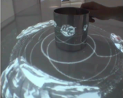 documentation / installation art / interactive artThis interactive installation is based on the phenomena of cylindrical anamorphosis. Distorted circular pictures projected around the chrome steel cup standing on the top of a table, showing its virtual surroundings. On the projection surface, these images are chaotic and incomprehensible. But when reflected on the surface of the mug, they form coherent moving images, representing the fictional environments of the object. As the visitor drags the mug on the tabletop, the projected anamorphic image follows its movements, showing different views of its virtual environment, just like it would reflect its real surroundings. more...